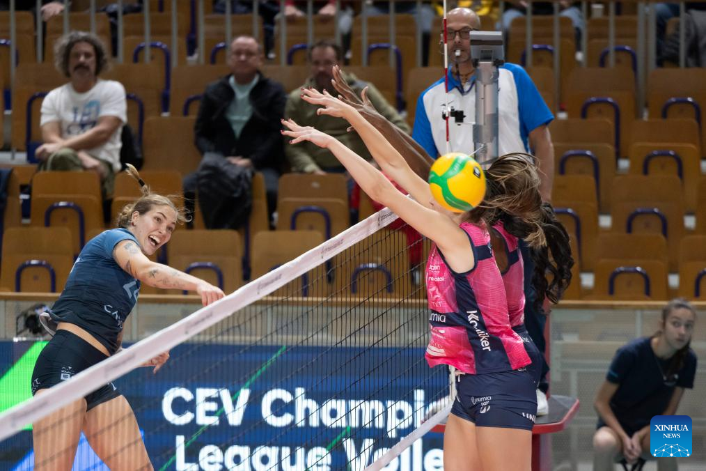 Eve Sarah Kerschenbaum (L) of Calcit Kamnik spikes during the Women's CEV Champions League Volley 2025 between Calcit Kamnik and Numia Vero Volley Milano in Ljubljana, Slovenia, Nov. 12, 2024. (Photo by Zeljko Stevanic/Xinhua)