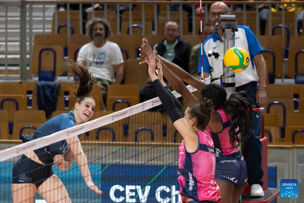 Hena Kurtagic (2nd R) of Numia Vero Volley Milano spikes the ball during the Women's CEV Champions League Volley 2025 between Calcit Kamnik and Numia Vero Volley Milano in Ljubljana, Slovenia, Nov. 12, 2024. (Photo by Zeljko Stevanic/Xinhua)