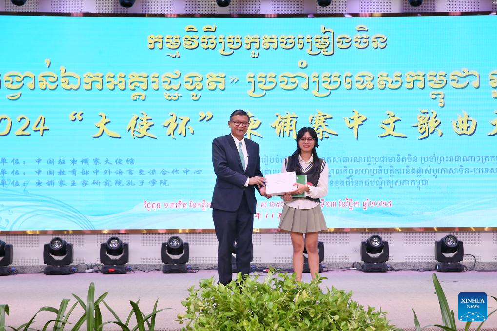 Cambodian Minister of Education, Youth and Sport Hang Chuon Naron (L), also a Cambodian deputy prime minister, presents award to the winner of a Chinese song competition in Phnom Penh, Cambodia, Nov. 13, 2024. (Photo by Phearum/Xinhua)