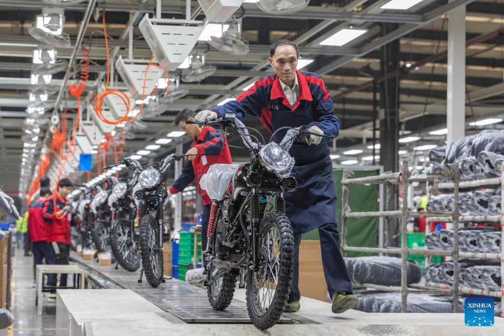 Staff members work on an assembly line at Chongqing Shineray Motorcycle Co., Ltd. in Chongqing, southwest China, Nov. 13, 2024. Shineray is an export-oriented enterprise based in Chongqing, with its products mainly targeting Latin American market.