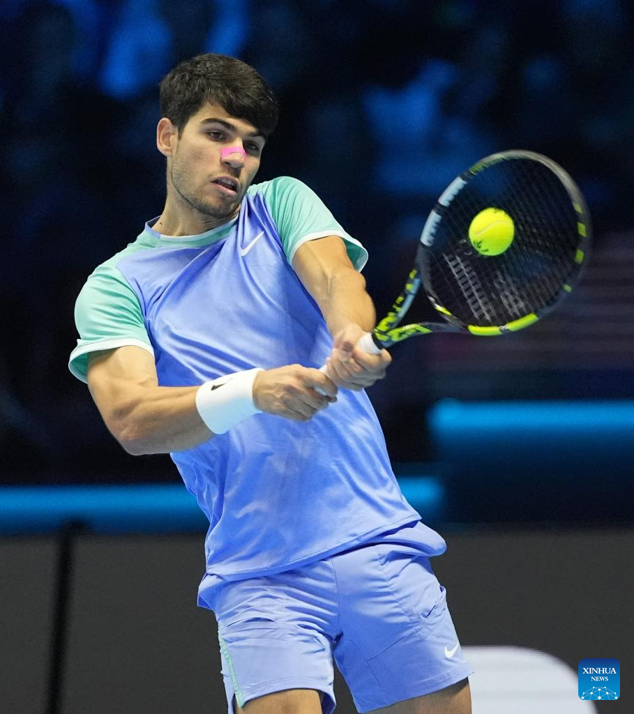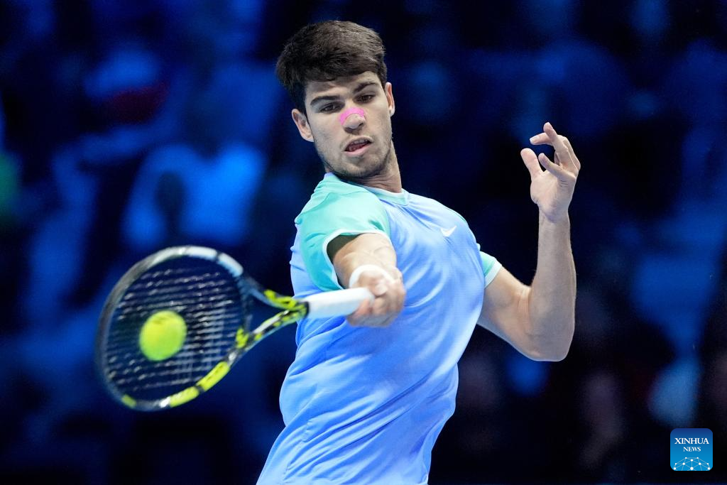 Carlos Alcaraz of Spain hits a return during the round robin match against Alexander Zverev of Germany at the Nitto ATP Finals in Turin, Italy, on Nov. 15, 2024. (Xinhua)