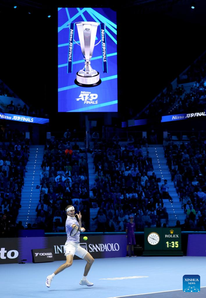 Alexander Zverev of Germany hits a return during the round robin match against Carlos Alcaraz of Spain at the Nitto ATP Finals in Turin, Italy, on Nov. 15, 2024. (Xinhua)