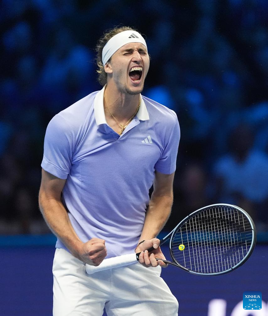Alexander Zverev of Germany celebrates a point during the round robin match against Carlos Alcaraz of Spain at the Nitto ATP Finals in Turin, Italy, on Nov. 15, 2024. (Xinhua)