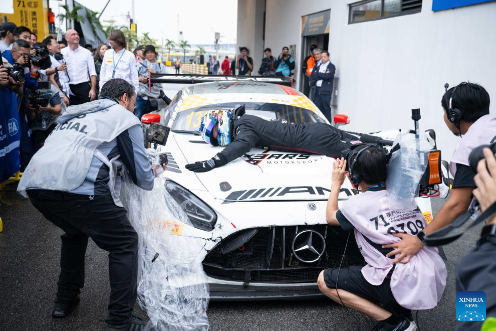 Maro Engel (top) of Germany celebrates after the Macao GT Cup-FIA GT World Cup race at the 71st Macao Grand Prix in Macao, south China, Nov. 17, 2024. (Xinhua/Cheong Kam Ka)