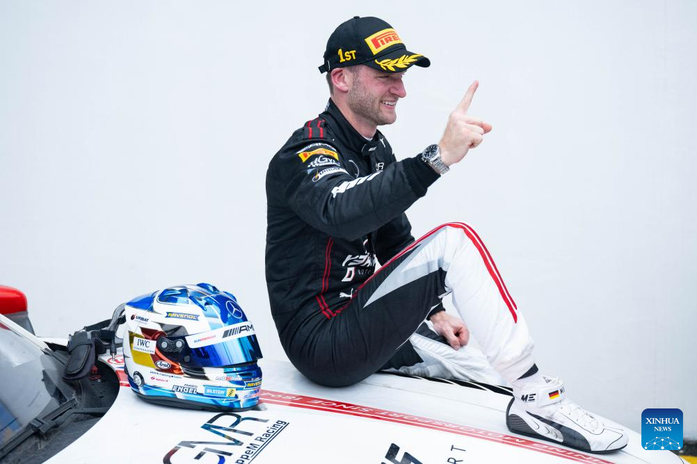 Maro Engel of Germany celebrates after the Macao GT Cup-FIA GT World Cup race at the 71st Macao Grand Prix in Macao, south China, Nov. 17, 2024. (Xinhua/Cheong Kam Ka)
