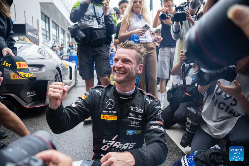 Maro Engel (C) of Germany reacts after the Macao GT Cup-FIA GT World Cup race at the 71st Macao Grand Prix in Macao, south China, Nov. 17, 2024. (Xinhua/Cheong Kam Ka)