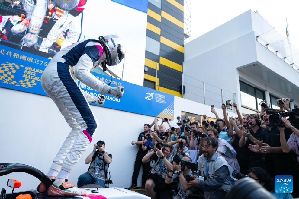 Ugo Ugochukwu (top) of the United States celebrates after winning the FIA FR World Cup race at the 71st Macao Grand Prix in Macao, south China, Nov. 17, 2024. (Xinhua/Cheong Kam Ka)