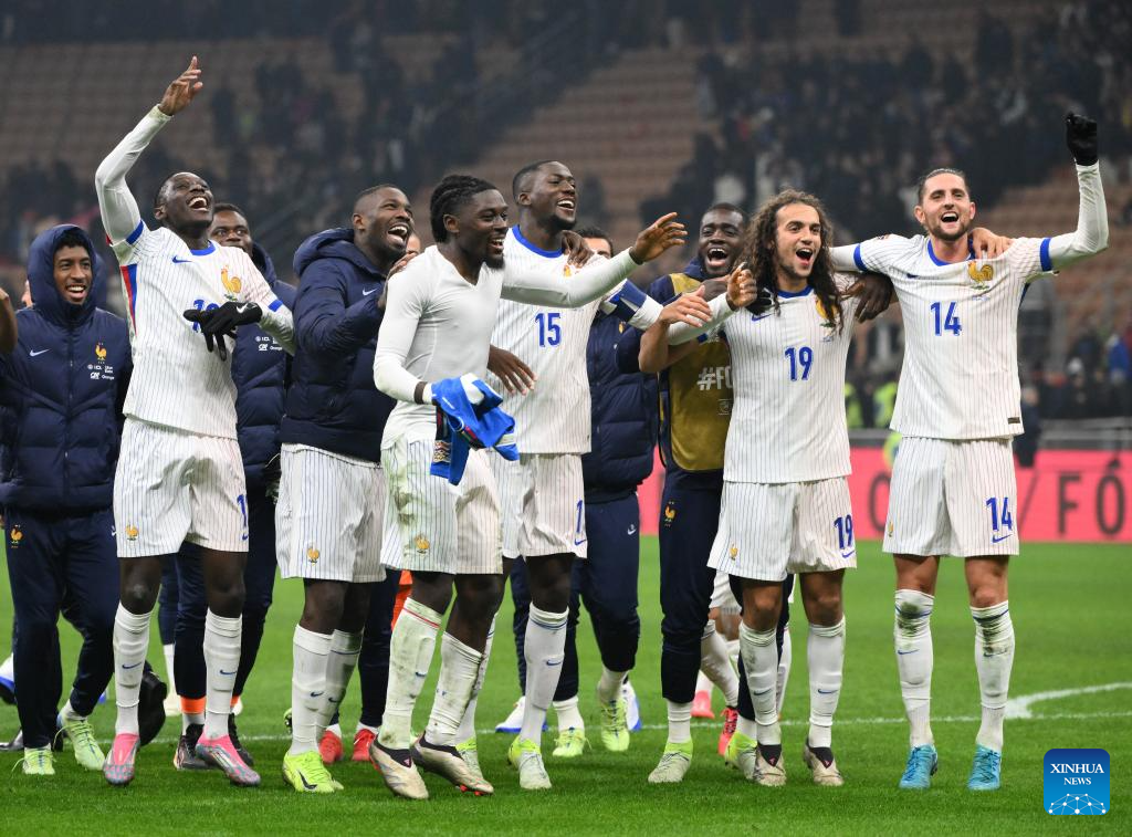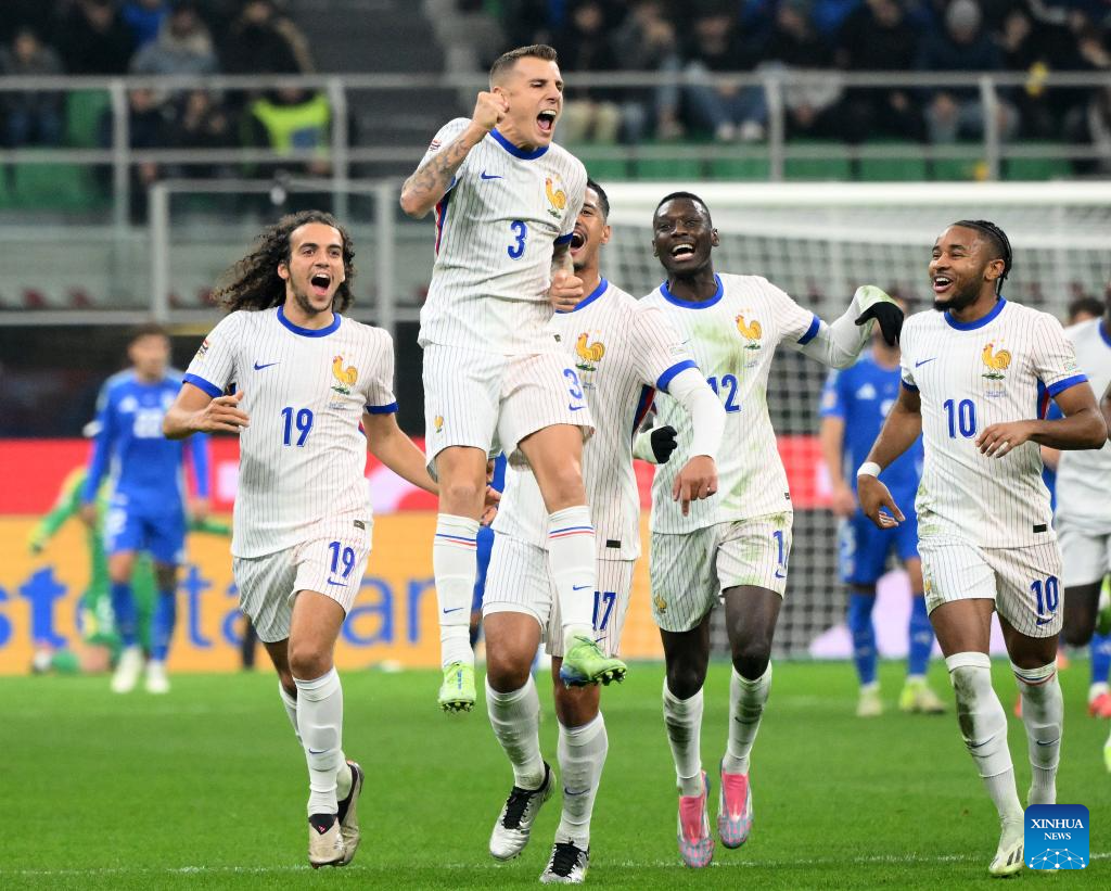 Players of France celebrate after winning the UEFA Nations League 2024/25 League A Group 2 football match between Italy and France in Milan, Italy, Nov. 17, 2024. (Photo by Alberto Lingria/Xinhua)