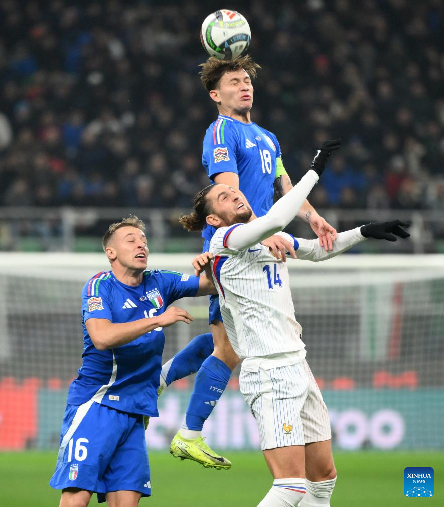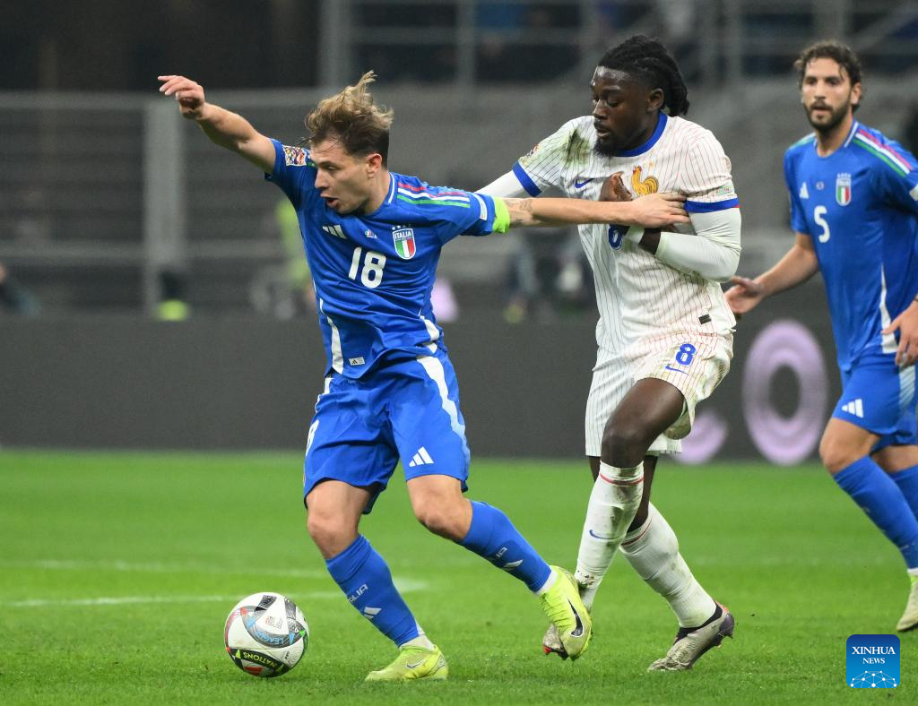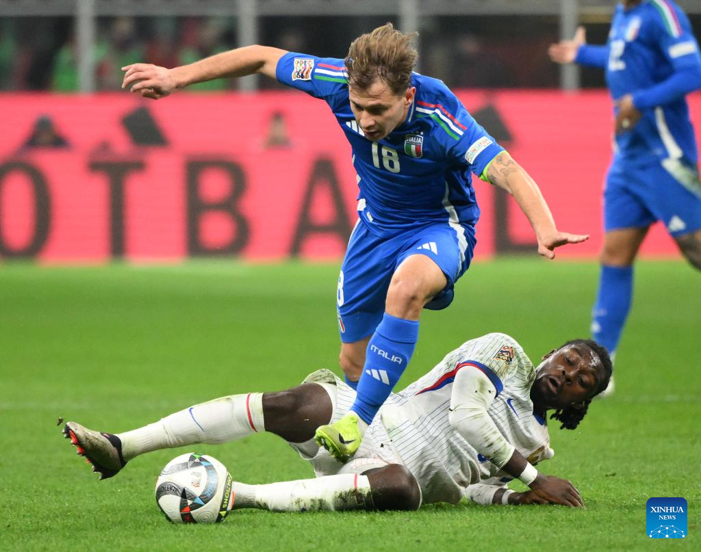 Nicolo Barella (top) of Italy vies for the ball against Manu Kone of France during the UEFA Nations League 2024/25 League A Group 2 football match between Italy and France in Milan, Italy, Nov. 17, 2024. (Photo by Alberto Lingria/Xinhua)