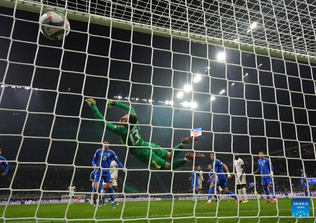 Goalkeeper Guglielmo Vicario of Italy fails to save the goal of Adrien Rabiot of France during the UEFA Nations League 2024/25 League A Group 2 football match between Italy and France in Milan, Italy, Nov. 17, 2024. (Photo by Alberto Lingria/Xinhua)