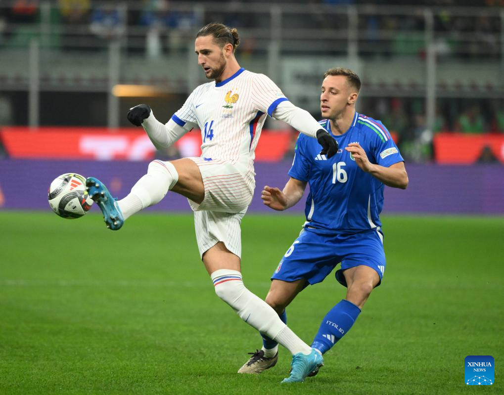 Adrien Rabiot of France celebrates his goal during the UEFA Nations League 2024/25 League A Group 2 football match between Italy and France in Milan, Italy, Nov. 17, 2024. (Photo by Alberto Lingria/Xinhua)