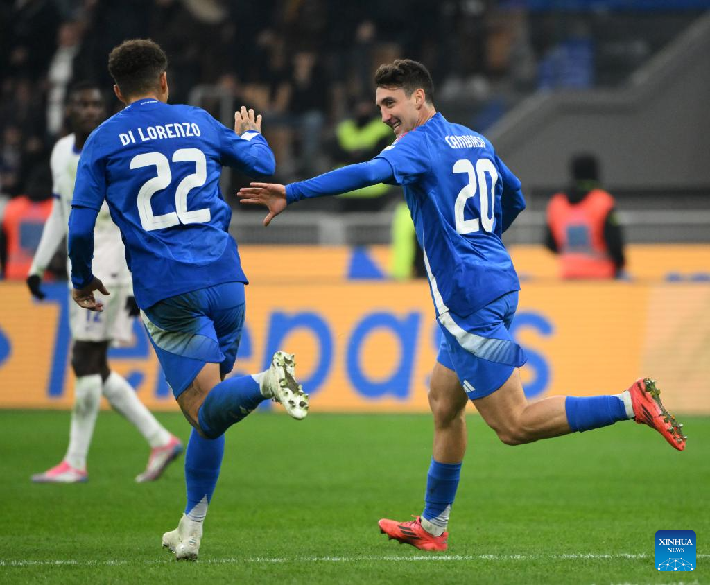Andrea Cambiaso (R) of Italy celebrates his goal with his teammate Giovanni Di Lorenzo during the UEFA Nations League 2024/25 League A Group 2 football match between Italy and France in Milan, Italy, Nov. 17, 2024. (Photo by Alberto Lingria/Xinhua)