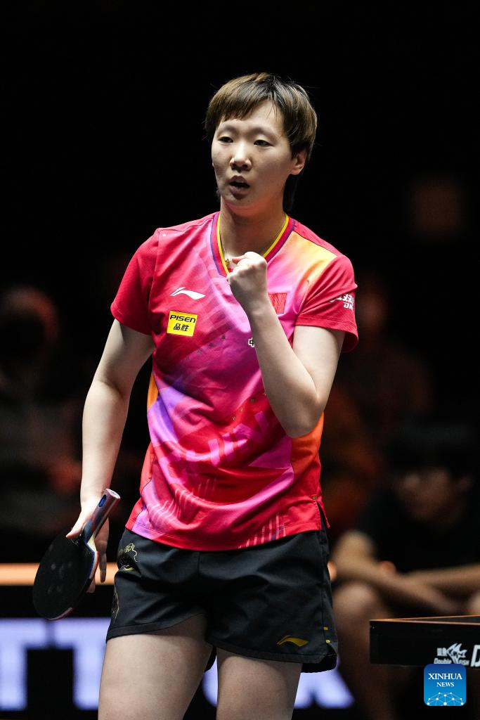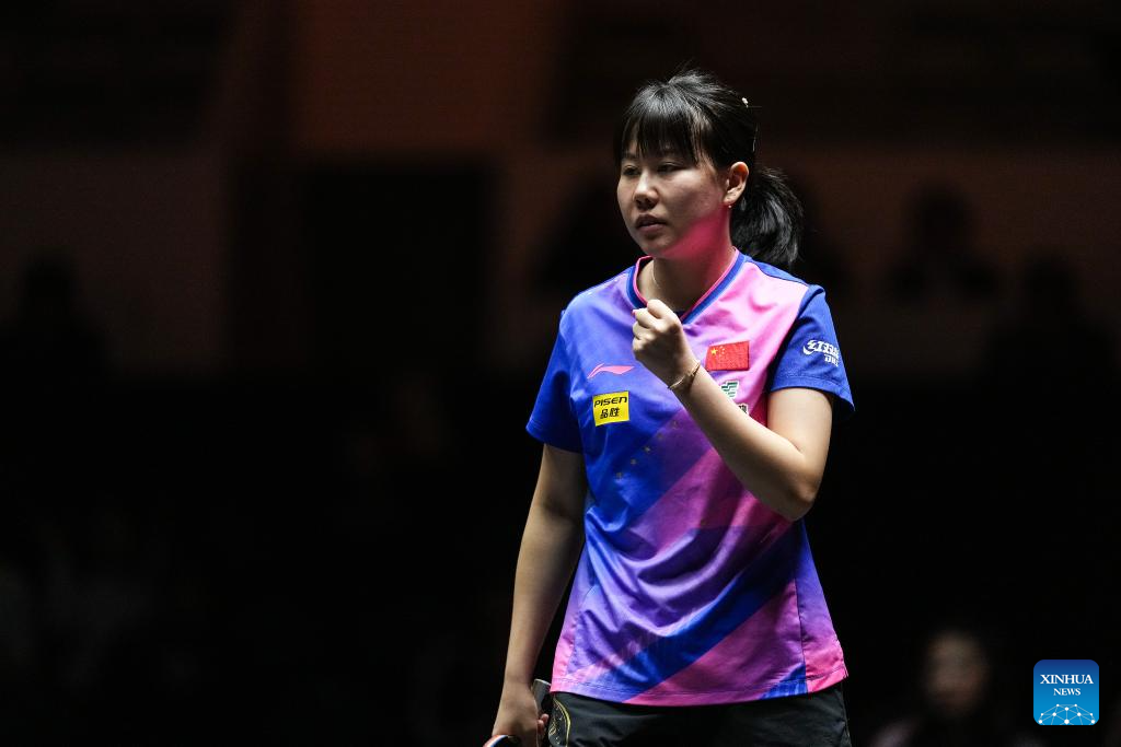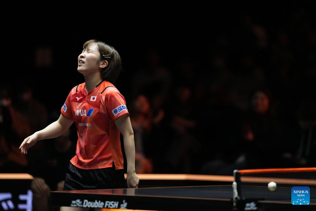 Wang Yidi reacts during the women's singles quarterfinal match between Wang Yidi of China and Harimoto Miwa of Japan at World Table Tennis (WTT) Finals Fukuoka 2024 in Kitakyushu, Japan, on Nov. 22, 2024. (Xinhua/Zhang Xiaoyu)