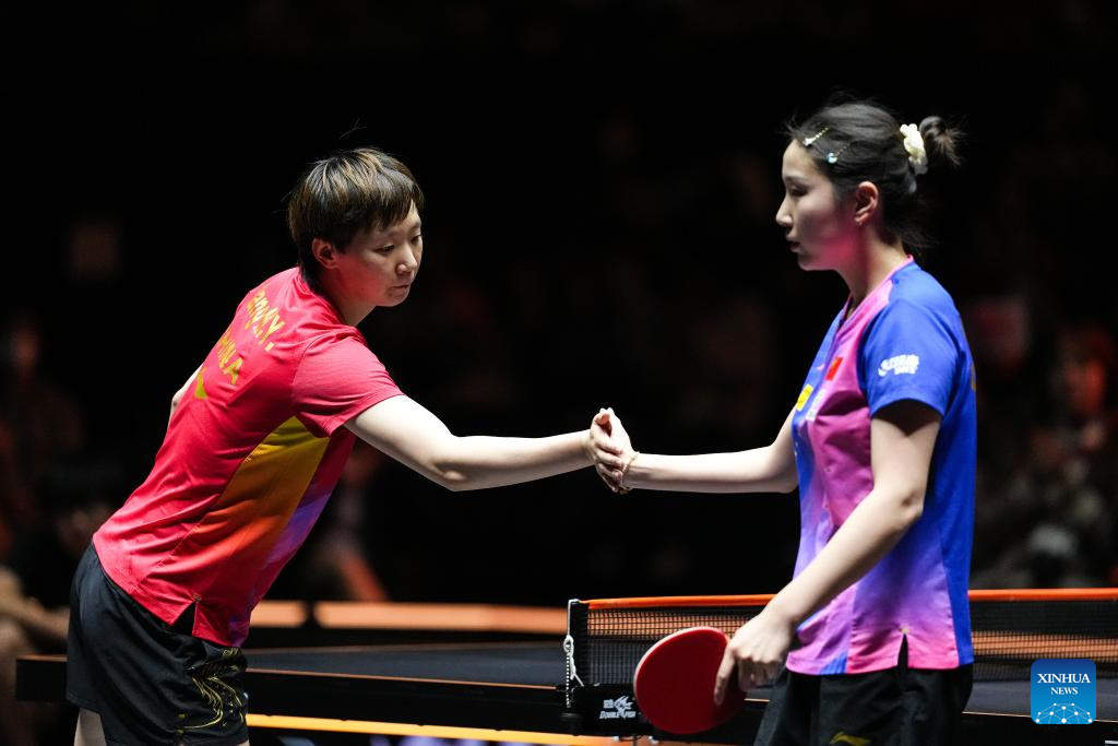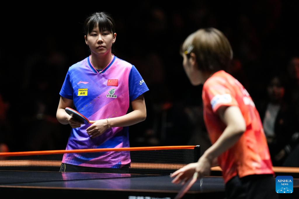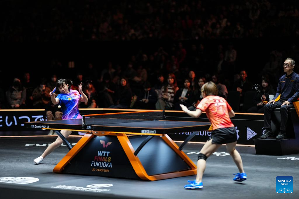 Qian Tianyi (L) of China hits a return during the women's singles quarterfinal against Wang Manyu of China at World Table Tennis (WTT) Finals Fukuoka 2024 in Kitakyushu, Japan, on Nov. 22, 2024. (Xinhua/Zhang Xiaoyu)