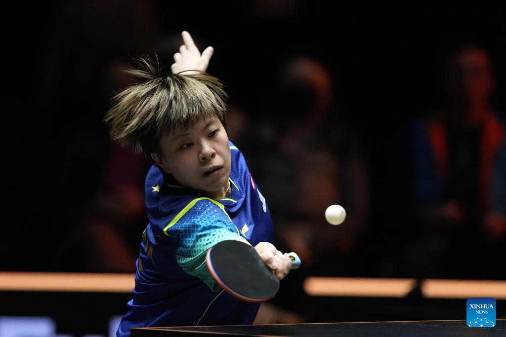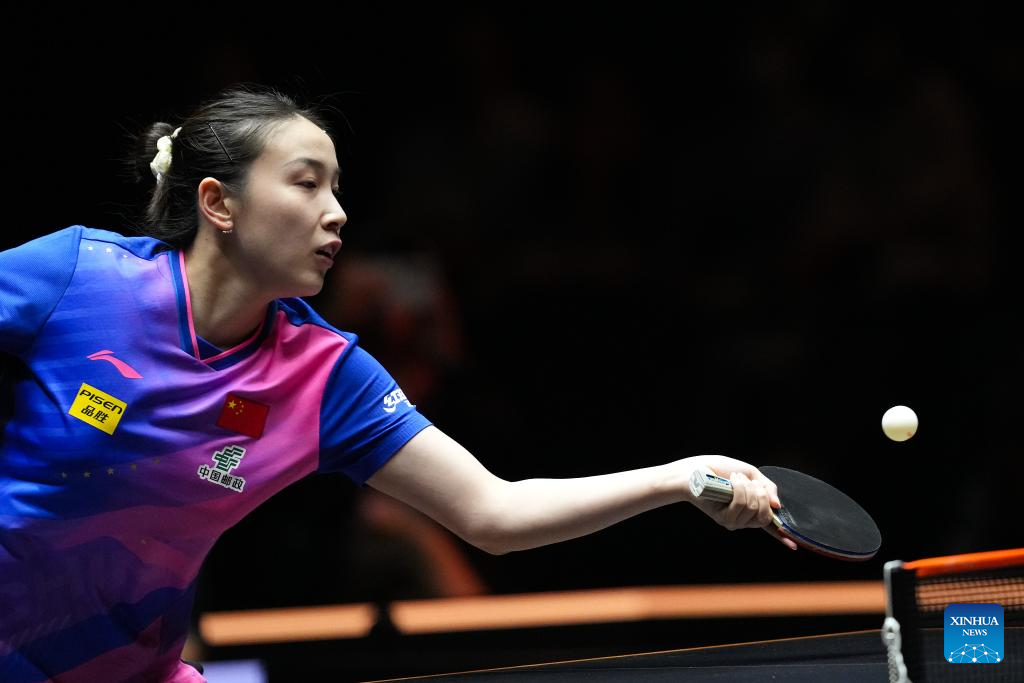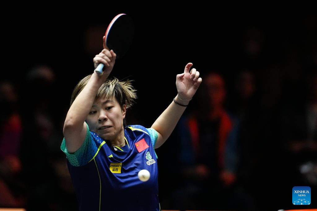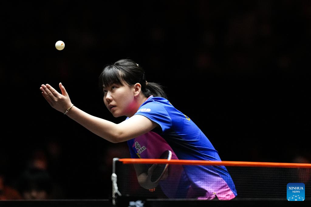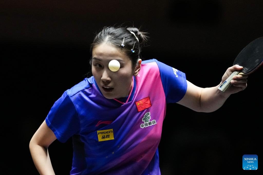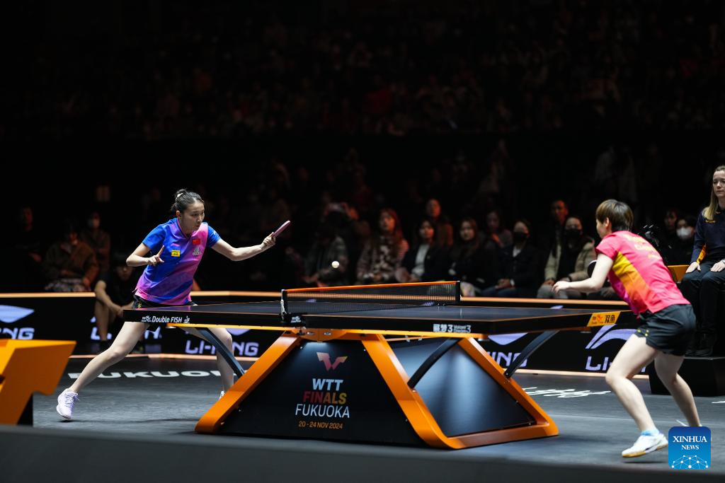 Wang Manyu of China hits a return during the women's singles quarterfinal against Qian Tianyi of China at World Table Tennis (WTT) Finals Fukuoka 2024 in Kitakyushu, Japan, on Nov. 22, 2024. (Xinhua/Zhang Xiaoyu)