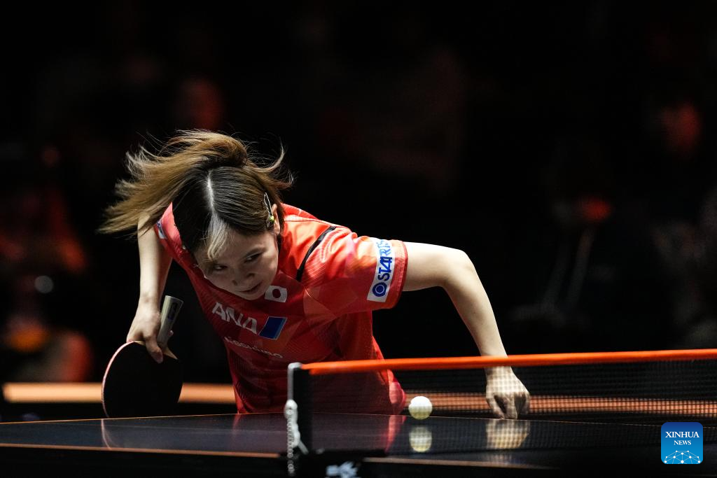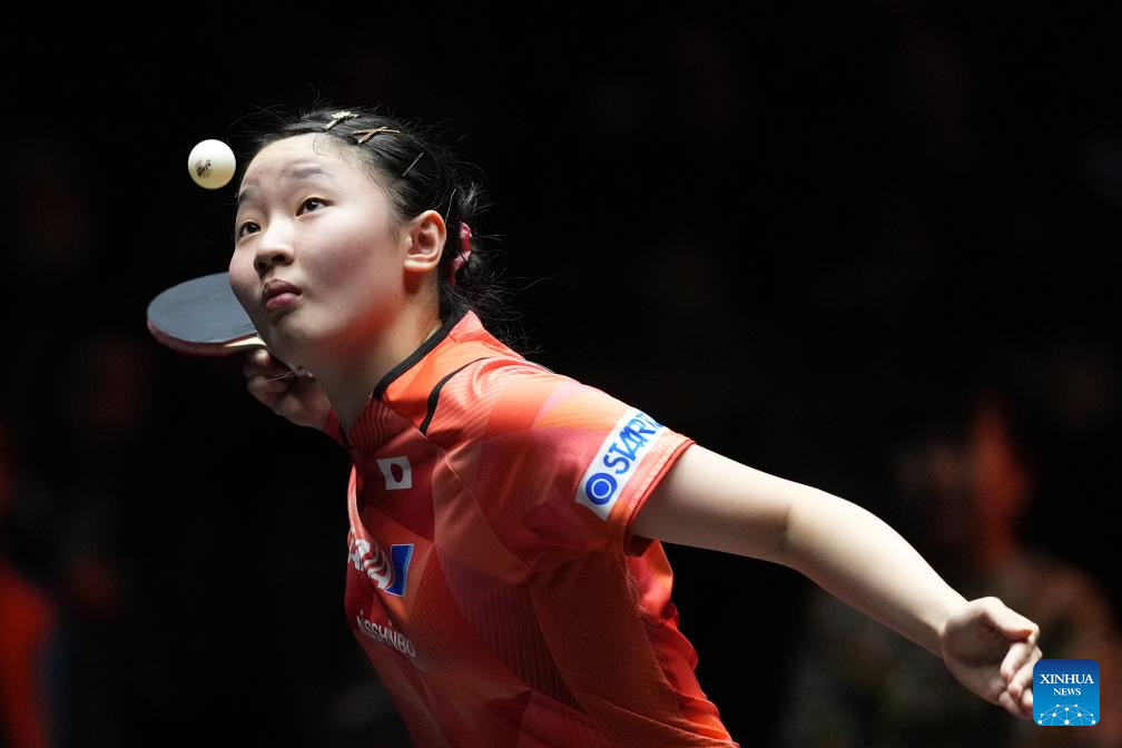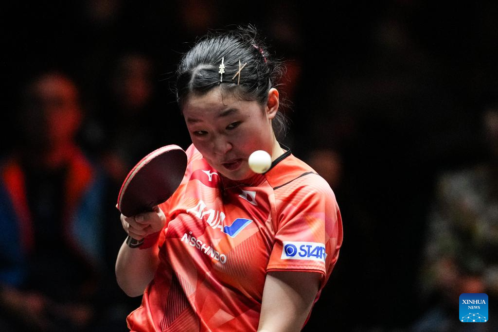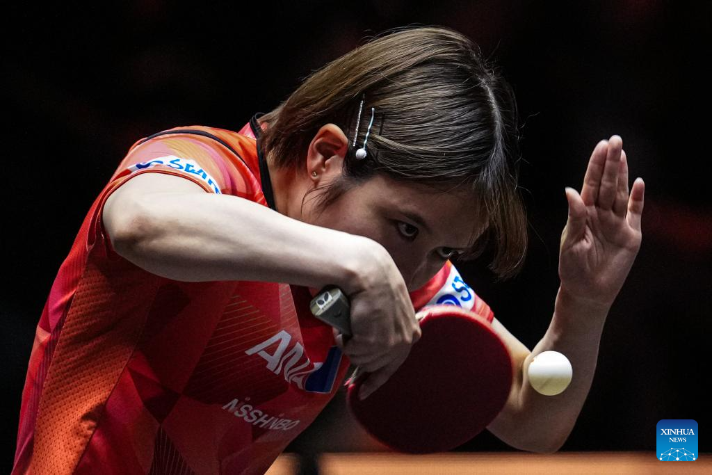 Harimoto Miwa hits a return during the women's singles quarterfinal match between Wang Yidi of China and Harimoto Miwa of Japan at World Table Tennis (WTT) Finals Fukuoka 2024 in Kitakyushu, Japan, on Nov. 22, 2024. (Xinhua/Zhang Xiaoyu)