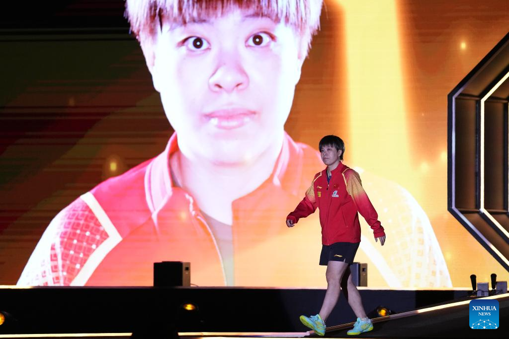 Wang Yidi walks in before the women's singles quarterfinal match between Wang Yidi of China and Harimoto Miwa of Japan at World Table Tennis (WTT) Finals Fukuoka 2024 in Kitakyushu, Japan, on Nov. 22, 2024. (Xinhua/Zhang Xiaoyu)