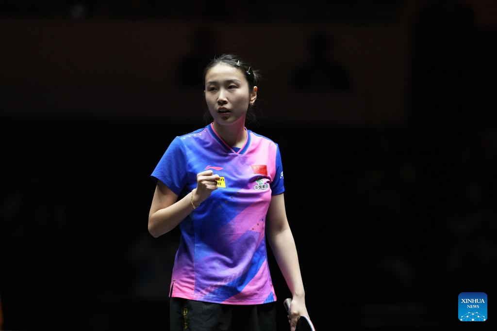Wang Manyu of China reacts during the women's singles quarterfinal against Qian Tianyi of China at World Table Tennis (WTT) Finals Fukuoka 2024 in Kitakyushu, Japan, on Nov. 22, 2024. (Xinhua/Zhang Xiaoyu)