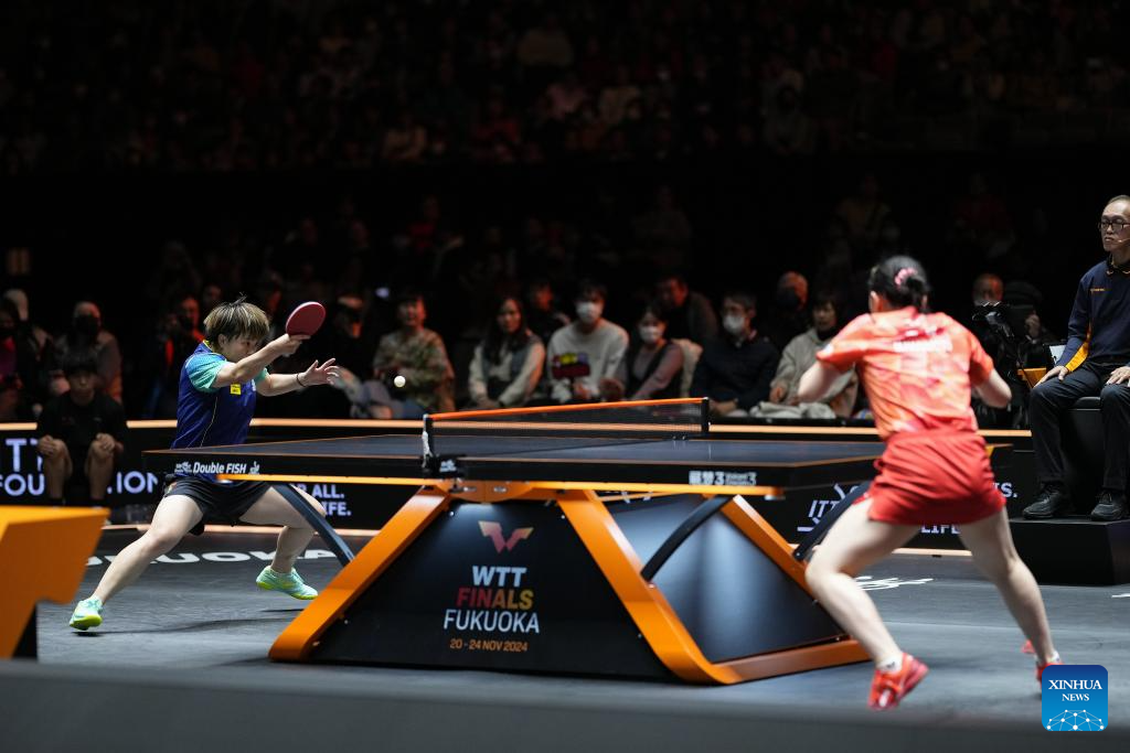 Wang Yidi (L) hits a return during the women's singles quarterfinal match between Wang Yidi of China and Harimoto Miwa of Japan at World Table Tennis (WTT) Finals Fukuoka 2024 in Kitakyushu, Japan, on Nov. 22, 2024. (Xinhua/Zhang Xiaoyu)