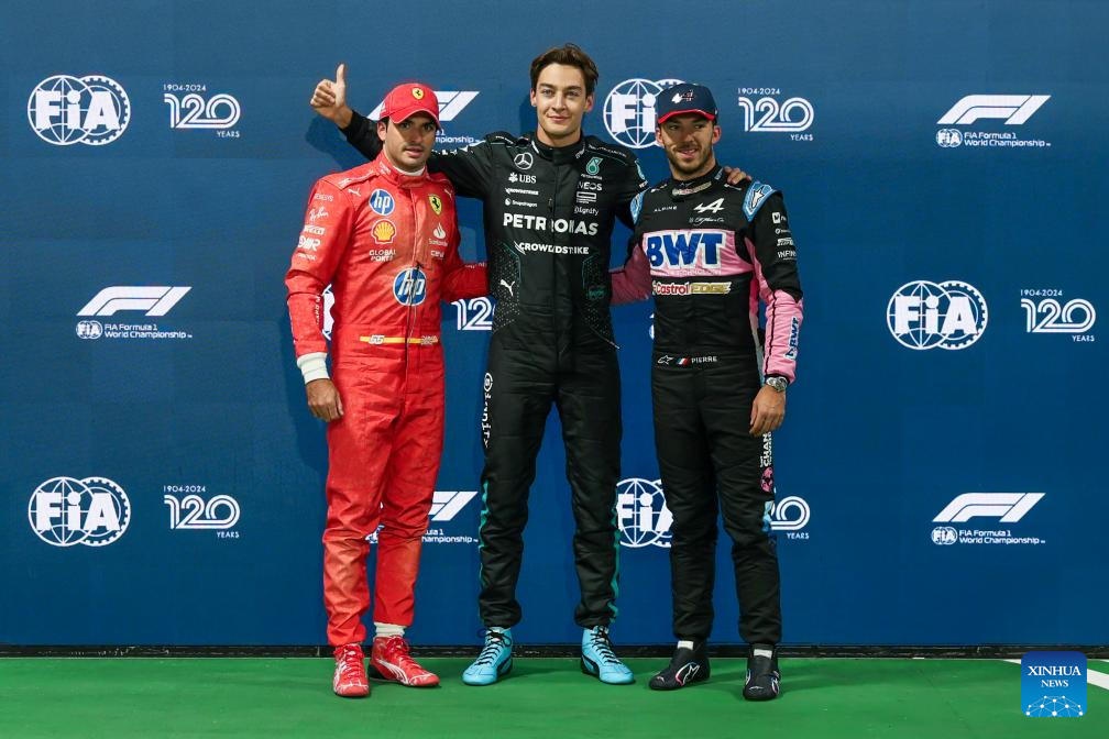 Carlos Sainz Jr, George Russell and Pierre Gasly (L to R) pose for photos after the qualifying session of the 2024 Formula One U.S. Grand Prix at Las Vegas Circuit, in Las Vegas, the United States, Nov. 22, 2024. (Photo by Qian Jun/Xinhua)