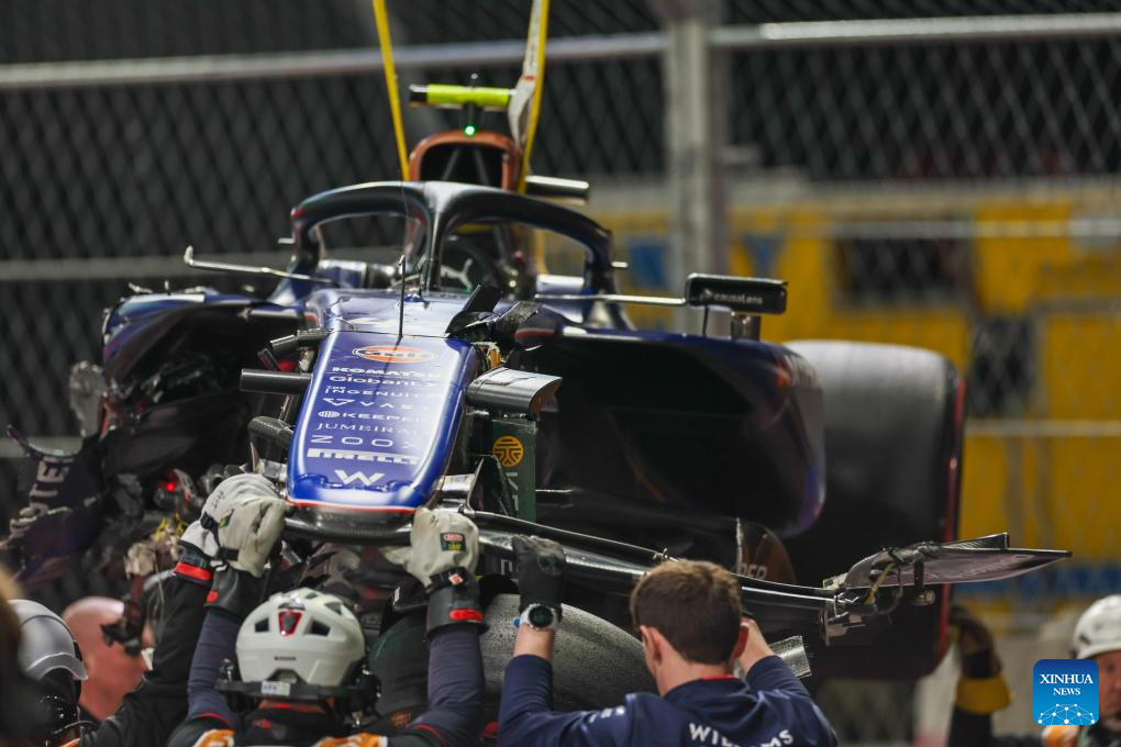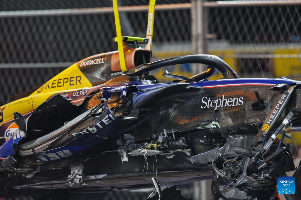 Argentina driver Franco Colapinto's car is rescued after crash during the qualifying session of the 2024 Formula One U.S. Grand Prix at Las Vegas Circuit, in Las Vegas, the United States, Nov. 22, 2024. (Photo by Qian Jun/Xinhua)