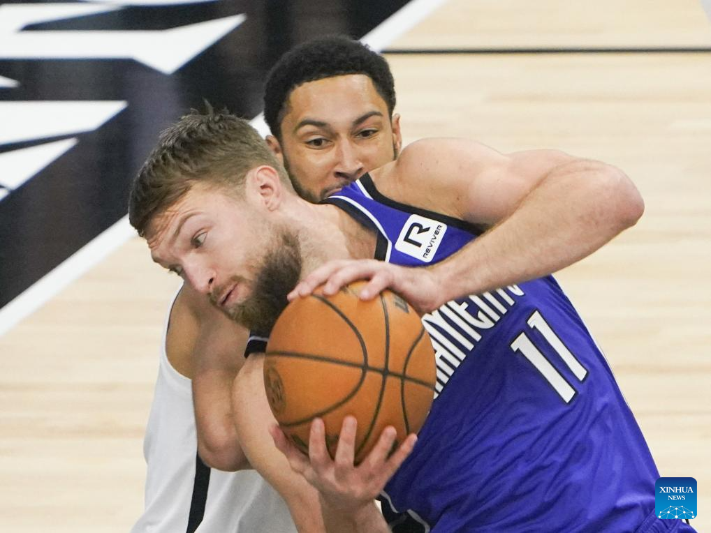 Domantas Sabonis (front) of Sacramento Kings vies with Ben Simmons of Brooklyn Nets during the NBA regular season game between Sacramento Kings and Brooklyn Nets in Sacramento, the United States, on Nov. 24, 2024. (Xinhua/Wu Xiaoling)