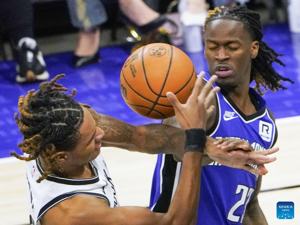 Keon Ellis (R) of Sacramento Kings vies for the ball during the NBA regular season game between Sacramento Kings and Brooklyn Nets in Sacramento, the United States, on Nov. 24, 2024. (Xinhua/Wu Xiaoling)