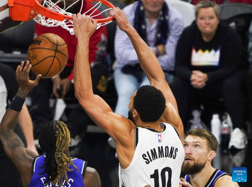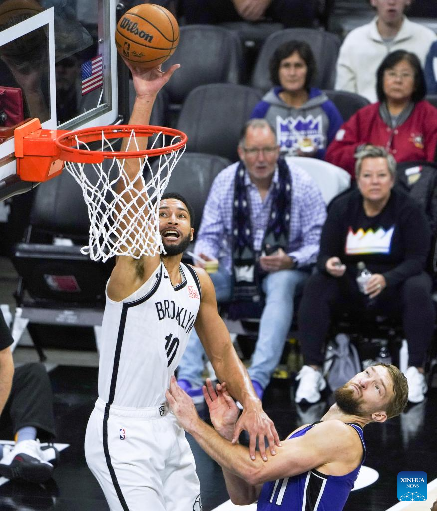 Ben Simmons (L) of Brooklyn Nets goes to the basket during the NBA regular season game between Sacramento Kings and Brooklyn Nets in Sacramento, the United States, on Nov. 24, 2024. (Xinhua/Wu Xiaoling)
