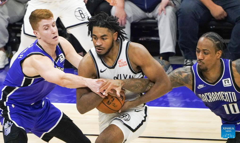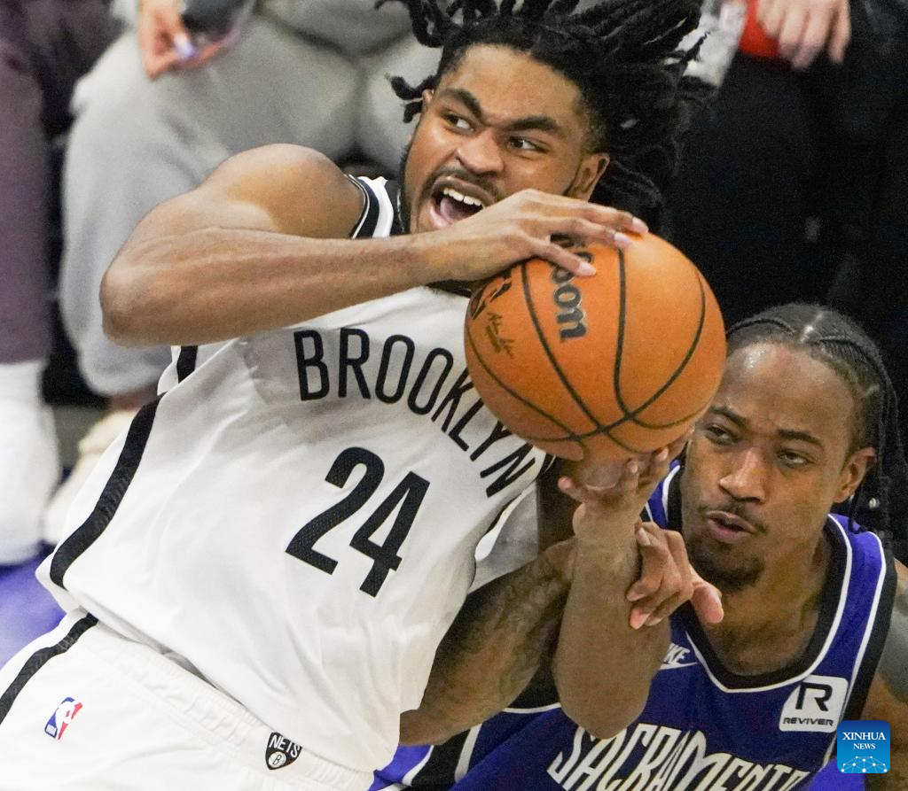 Cam Thomas (C) of Brooklyn Nets competes during the NBA regular season game between Sacramento Kings and Brooklyn Nets in Sacramento, the United States, on Nov. 24, 2024. (Xinhua/Wu Xiaoling)