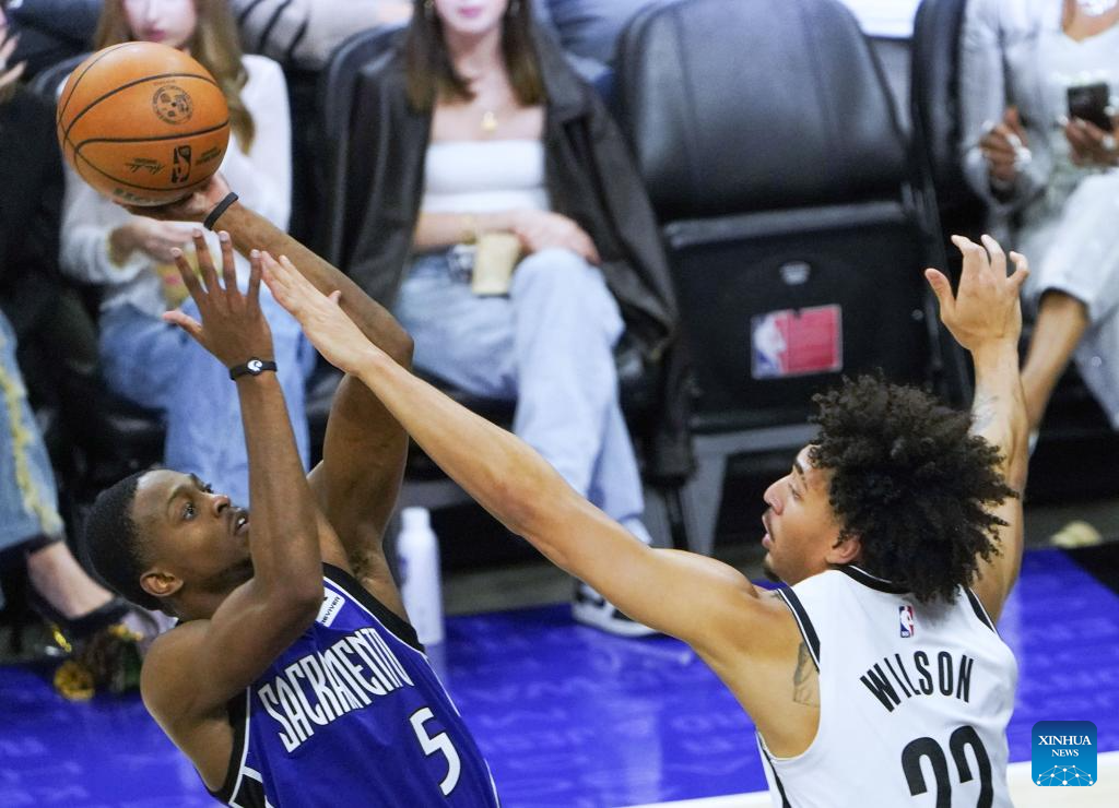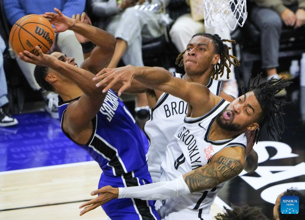 Keegan Murray (L) of Sacramento Kings goes to the basket during the NBA regular season game between Sacramento Kings and Brooklyn Nets in Sacramento, the United States, on Nov. 24, 2024. (Xinhua/Wu Xiaoling)