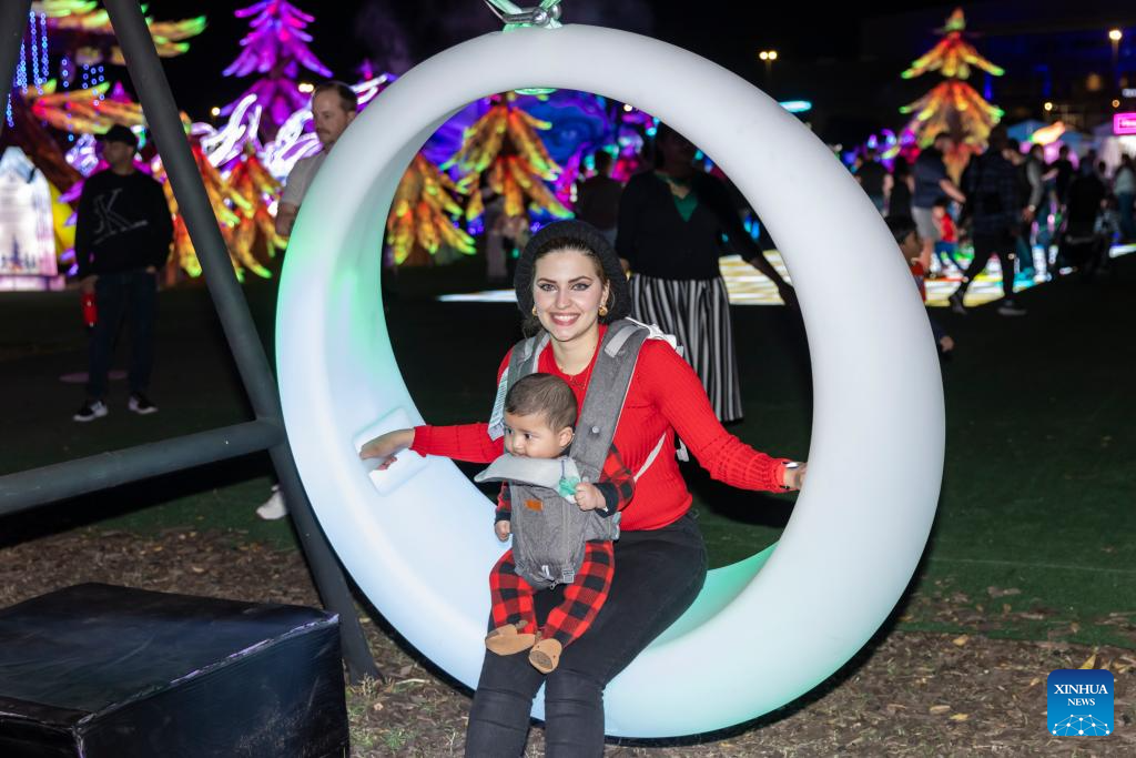 People visit the Tianyu Lights Festival in the suburb of Dallas, Texas, the United States, on Nov. 24, 2024. The event, running from Nov. 8, 2024 to Jan. 18, 2025, showcases stunning luminous art installations and nightly performances by acrobats and folk artists from China. (Photo by Dan Tian/Xinhua)