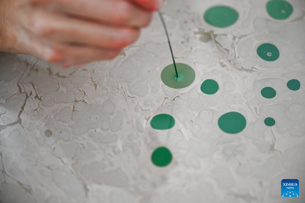 Li Xintong tests the paints for an Ebru creation in Istanbul, Türkiye, Nov. 5, 2024. Ebru, or the Turkish art of paper marbling, is a traditional painting art. To create an Ebru, the artist will have to paint on water and then transfer this painting onto paper. In 2014, Ebru was officially listed as a UNESCO World Intangible Culture Heritage.