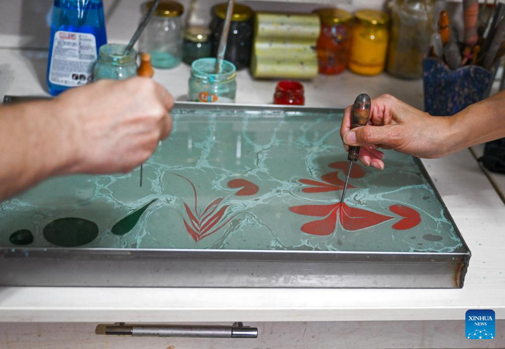 Li Xintong (R) and her teacher Erol Caglar work on a piece of Ebru art in Istanbul, Türkiye, Nov. 1, 2024. Ebru, or the Turkish art of paper marbling, is a traditional painting art. To create an Ebru, the artist will have to paint on water and then transfer this painting onto paper. In 2014, Ebru was officially listed as a UNESCO World Intangible Culture Heritage.