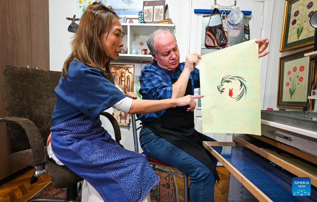Li Xintong (L) and her teacher Erol Caglar discuss the creation of Ebru art in Istanbul, Türkiye, Nov. 1, 2024. Ebru, or the Turkish art of paper marbling, is a traditional painting art. To create an Ebru, the artist will have to paint on water and then transfer this painting onto paper. In 2014, Ebru was officially listed as a UNESCO World Intangible Culture Heritage.