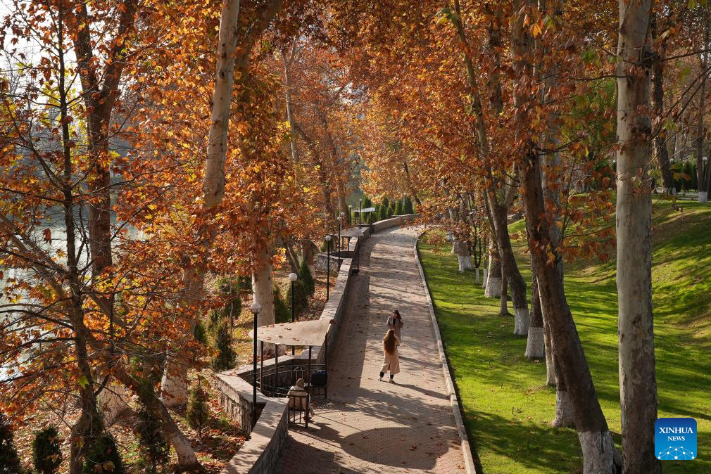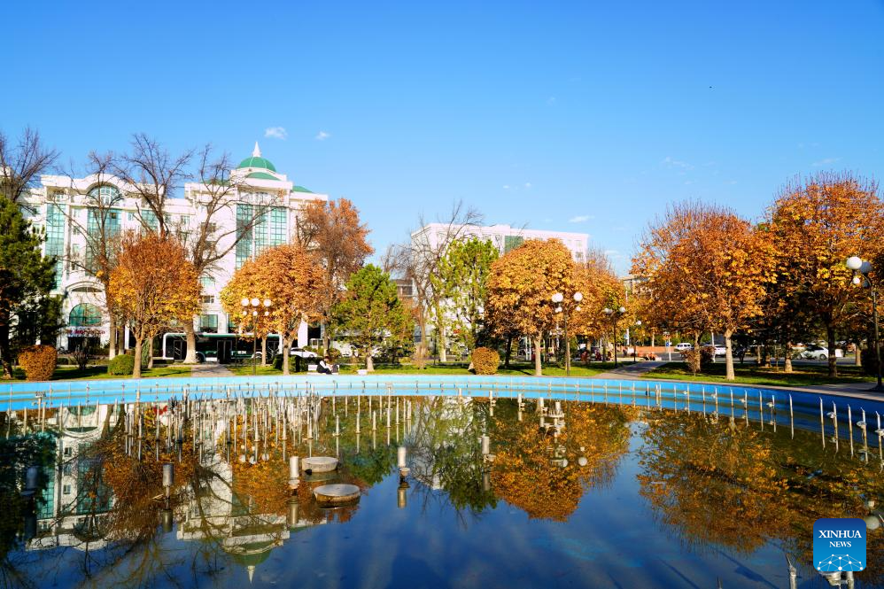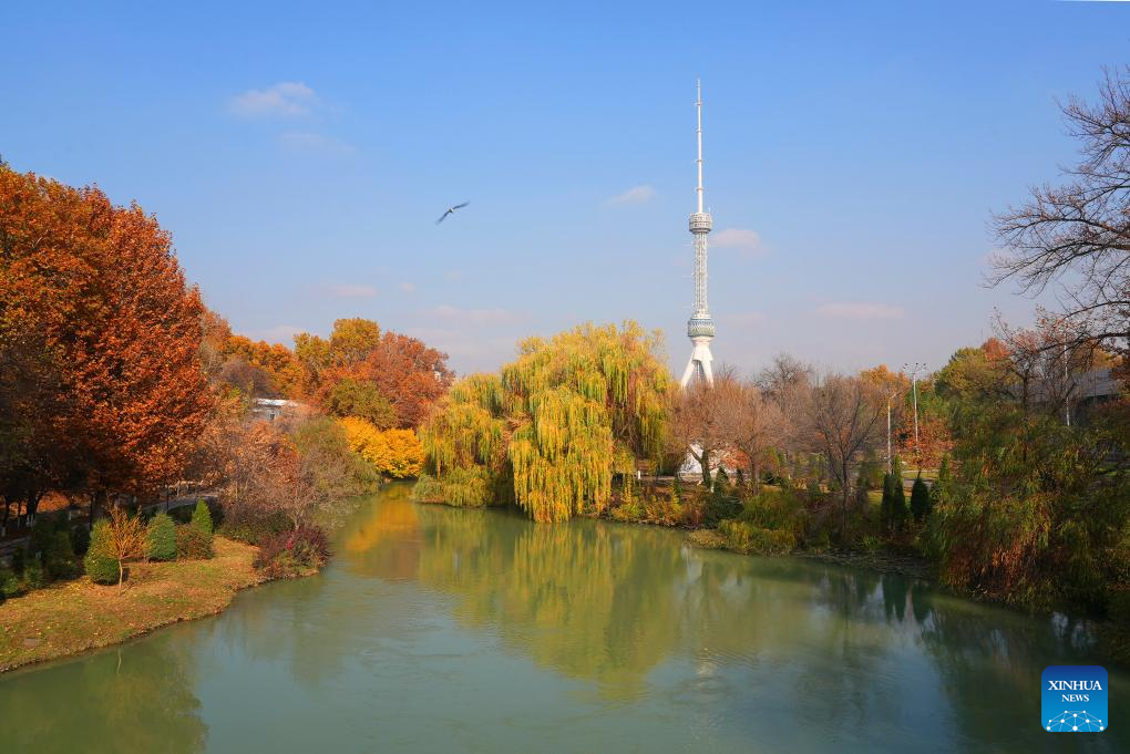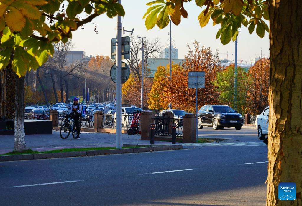 This photo taken on Nov. 26, 2024 shows the scenery in Tashkent, Uzbekistan. The city landscape is adorned with golden and yellow leaves in the season. (Photo by Zafar Khalilov/Xinhua)