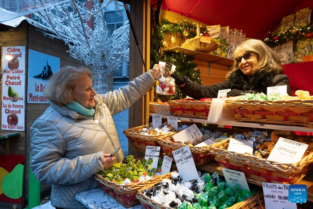A customer buys candies at the Christmas market in Lille, north France, Nov. 30, 2024. (Photo by Sebastien Courdji/Xinhua)