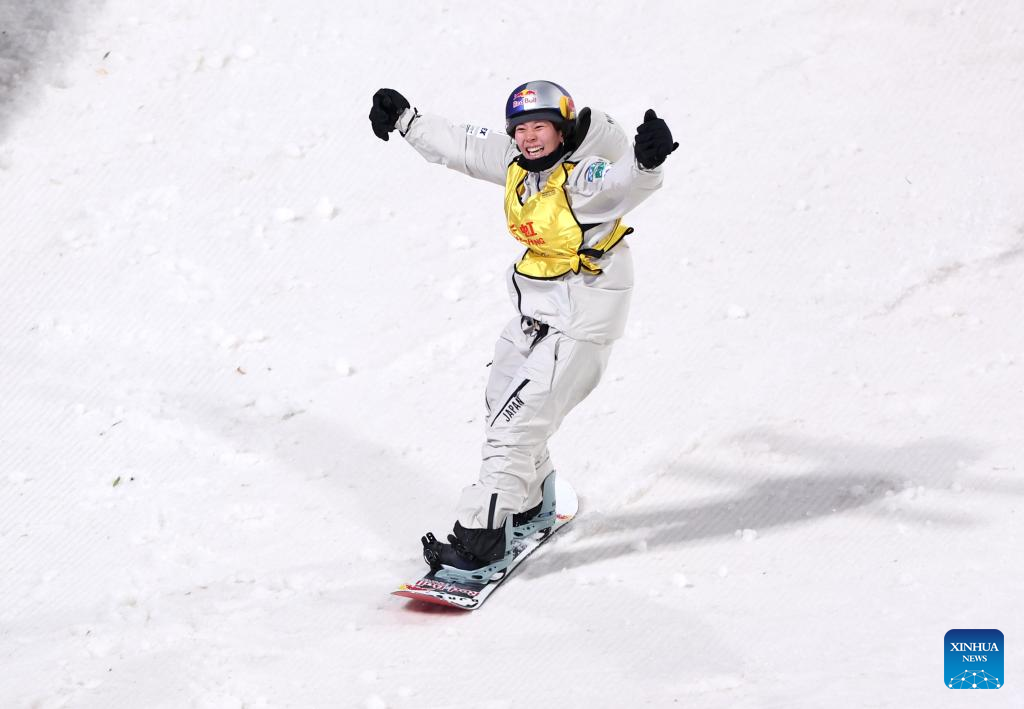 Fukada Mari of Japan celebrates during the women's snowboard final at the 2024-2025 FIS Snowboard & Freeski Big Air World Cup in Beijing, capital of China, on Dec. 1, 2024. (Xinhua/Zhang Chenlin)
