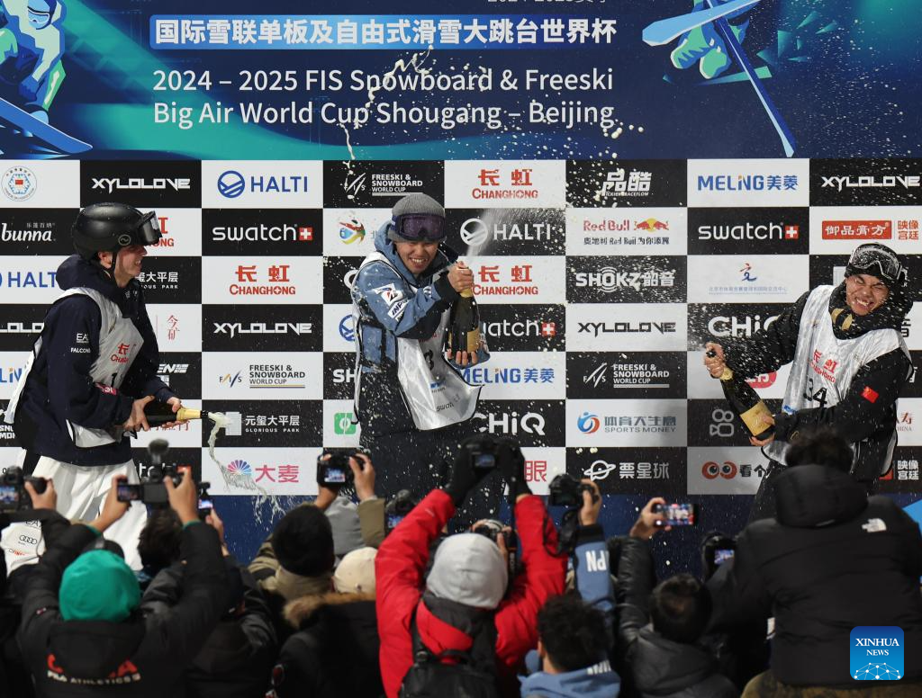 Gold medalist Ogiwara Hiroto (C) of Japan, silver medalist Ian Matteoli (L) of Italy and bronze medalist Yang Wenlong of China celebrate during the awarding ceremony for the men's snowboard final at the 2024-2025 FIS Snowboard & Freeski Big Air World Cup in Beijing, capital of China, on Dec. 1, 2024. (Xinhua/Zhang Chenlin)