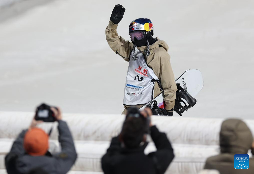 Su Yiming of China greets to the spectators during the men's snowboard final at the 2024-2025 FIS Snowboard & Freeski Big Air World Cup in Beijing, capital of China, on Dec. 1, 2024. (Xinhua/Zhang Chenlin)
