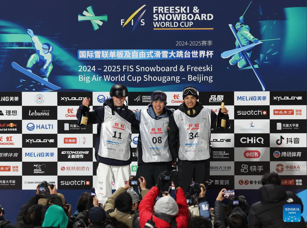 Gold medalist Ogiwara Hiroto (C) of Japan, silver medalist Ian Matteoli (L) of Italy and bronze medalist Yang Wenlong of China pose during the awarding ceremony for the men's snowboard final at the 2024-2025 FIS Snowboard & Freeski Big Air World Cup in Beijing, capital of China, on Dec. 1, 2024. (Xinhua/Zhang Chenlin)