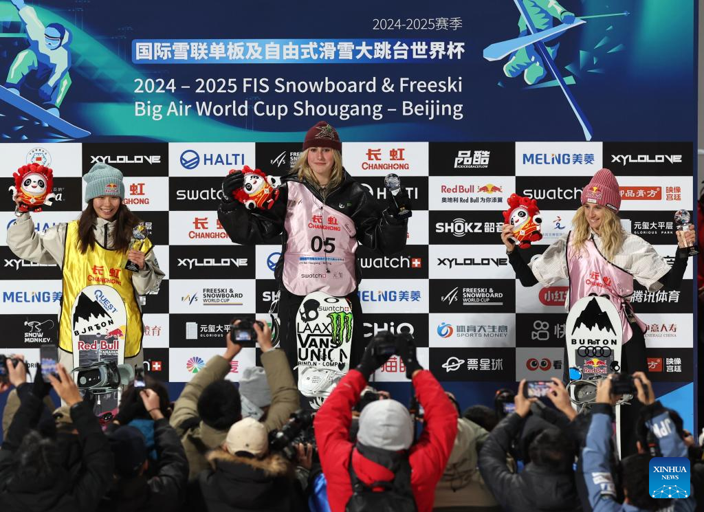 Gold medalist Mia Brookes (C) of Britain, silver medalist Fukada Mari (L) of Japan and bronze medalist Anna Gasser of Austria celebrate during the awarding ceremony for the women's snowboard final at the 2024-2025 FIS Snowboard & Freeski Big Air World Cup in Beijing, capital of China, on Dec. 1, 2024. (Xinhua/Zhang Chenlin)
