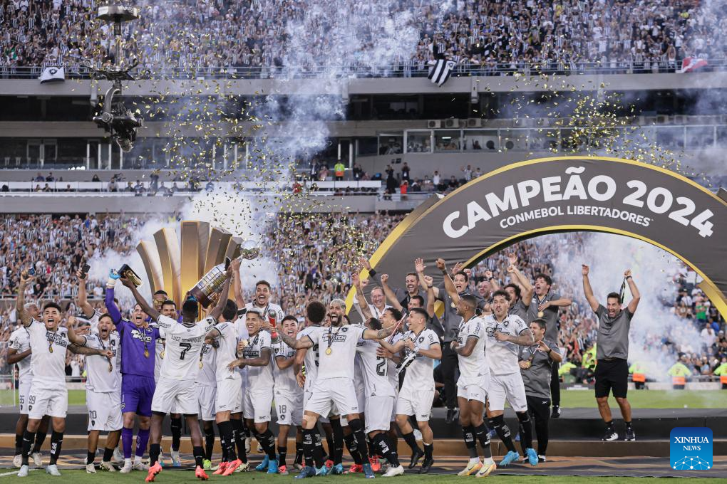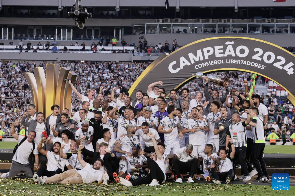 Players of Botafogo celebrate winning the final between Atletico Mineiro and Botafogo at the Copa Libertadores 2024 in Buenos Aires, Argentina, Nov. 30, 2024. (Photo by Luciano Gonzalez/Xinhua)