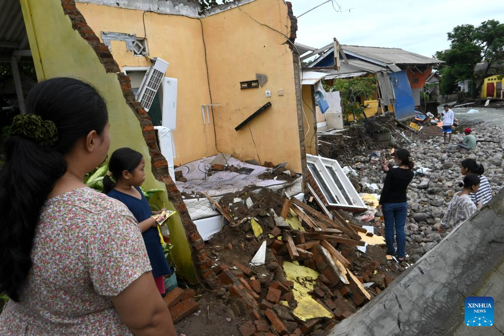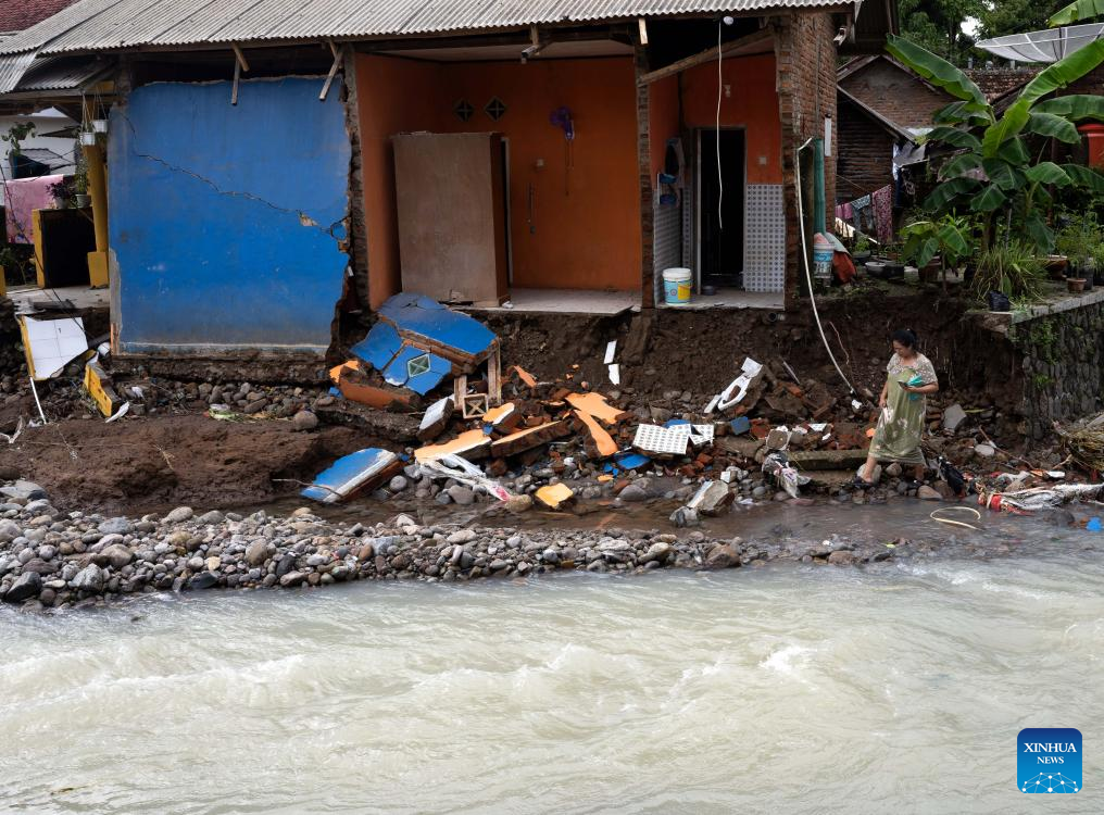 People stand near a damaged house after floods at Palabuhanratu in Sukabumi Regency, West Java Province, Indonesia, Dec. 5, 2024. Indonesia's Meteorological, Climatological, and Geophysical Agency (BMKG) announced on Wednesday that the country would face heavy rainfall during the upcoming Christmas and New Year holidays, urging people to remain vigilant. (Photo by Iman Firmansyah/Xinhua)