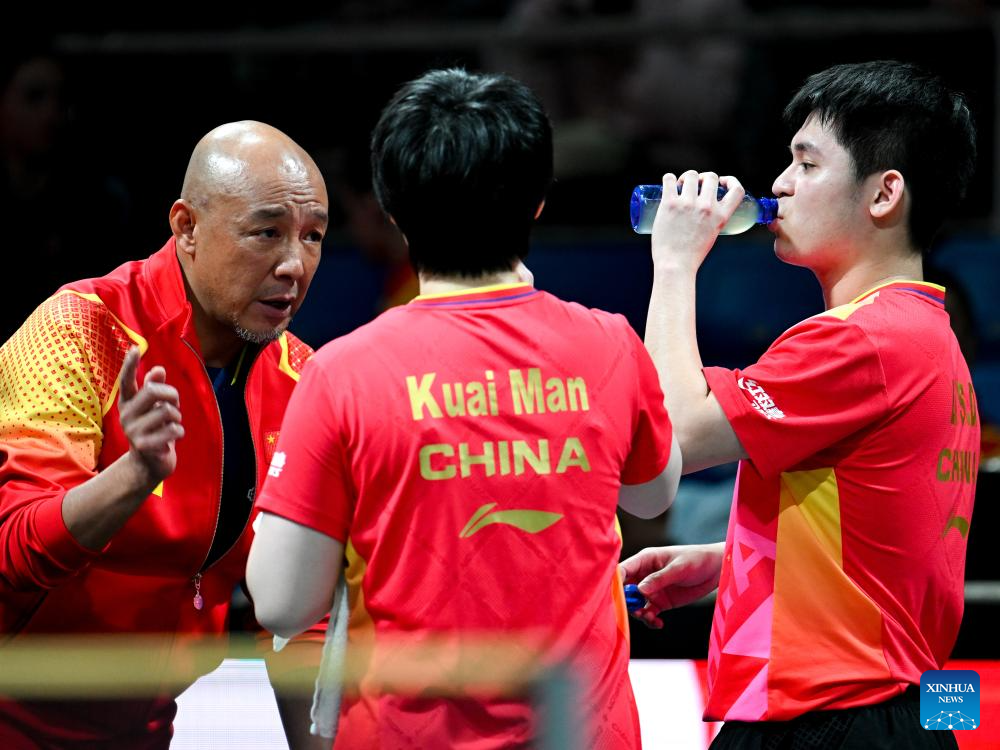Coach Xiao Zhan (L) instructs Lin Shidong (R) and Kuai Man of China during the mixed doubles match of the stage 2 group match between China and Germany at the ITTF Mixed Team World Cup 2024 in Chengdu, southwest China's Sichuan Province, Dec. 4, 2024. (Xinhua/Wang Xi)