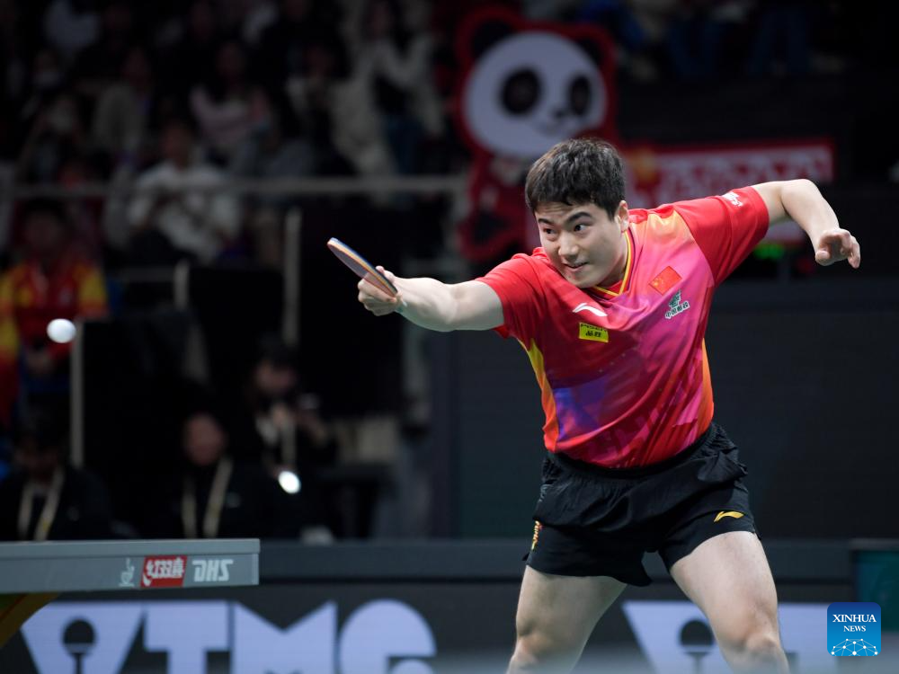 Liang Jingkun of China hits a return to Meng Fanbo of Germany during the men's singles match of the stage 2 group match between China and Germany at the ITTF Mixed Team World Cup 2024 in Chengdu, southwest China's Sichuan Province, Dec. 4, 2024. (Xinhua/Wang Xi)