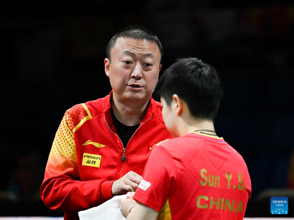 Coach Ma Lin (L) instructs Sun Yingsha of China during the women's singles match of the stage 2 group match between China and Germany at the ITTF Mixed Team World Cup 2024 in Chengdu, southwest China's Sichuan Province, Dec. 4, 2024. (Xinhua/Wang Xi)