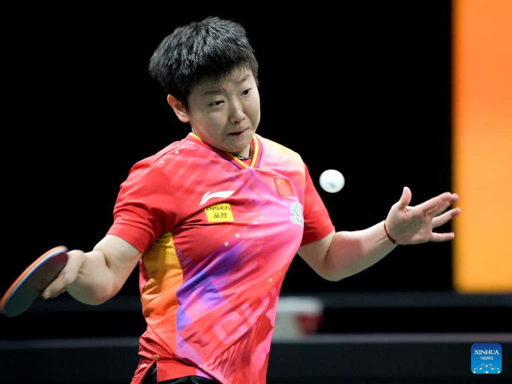 Sun Yingsha of China hits a return to Sophia Klee of Germany during the women's singles match of the stage 2 group match between China and Germany at the ITTF Mixed Team World Cup 2024 in Chengdu, southwest China's Sichuan Province, Dec. 4, 2024. (Xinhua/Wang Xi)