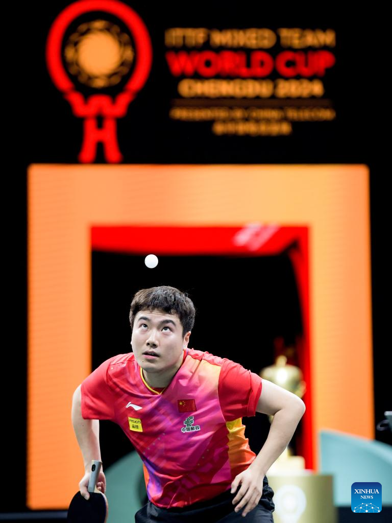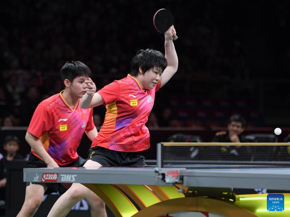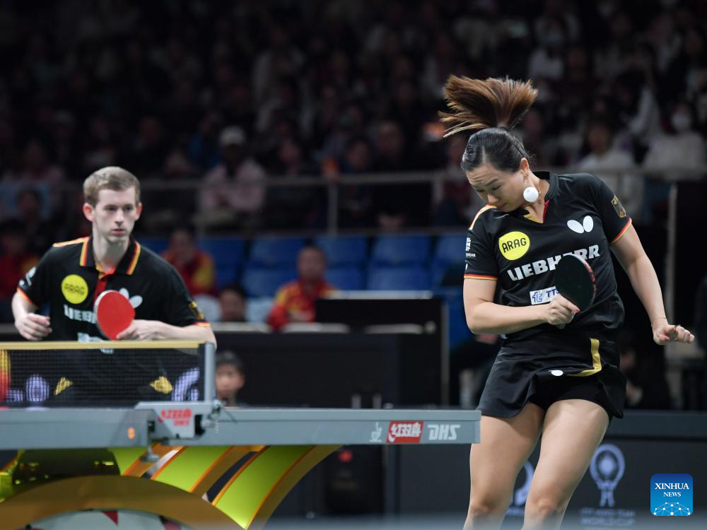 Lin Shidong/Kuai Man (R) of China compete against Cedric Meissner/Wan Yuan of Germany during the mixed doubles match of the stage 2 group match between China and Germany at the ITTF Mixed Team World Cup 2024 in Chengdu, southwest China's Sichuan Province, Dec. 4, 2024. (Xinhua/Wang Xi)