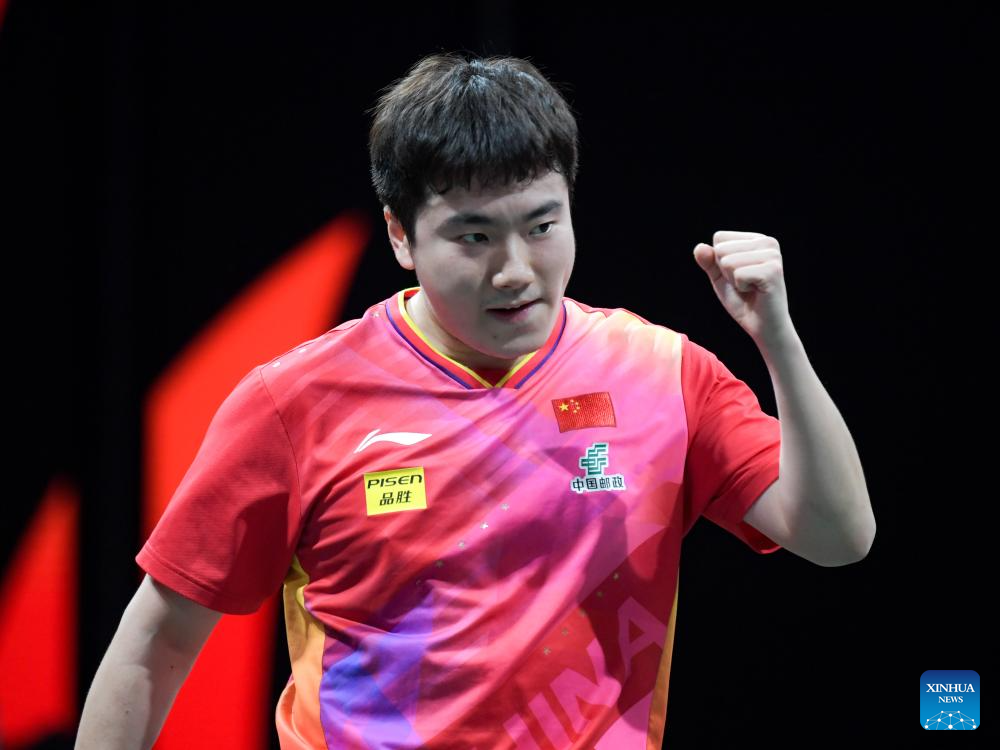 Liang Jingkun of China celebrates a point while competing against Meng Fanbo of Germany during the men's singles match of the stage 2 group match between China and Germany at the ITTF Mixed Team World Cup 2024 in Chengdu, southwest China's Sichuan Province, Dec. 4, 2024. (Xinhua/Wang Xi)