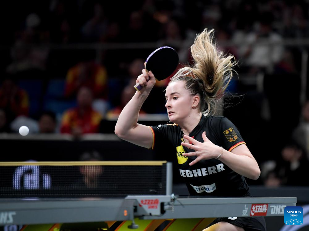 Sophia Klee of Germany hits a return to Sun Yingsha of China during the women's singles match of the stage 2 group match between China and Germany at the ITTF Mixed Team World Cup 2024 in Chengdu, southwest China's Sichuan Province, Dec. 4, 2024. (Xinhua/Wang Xi)